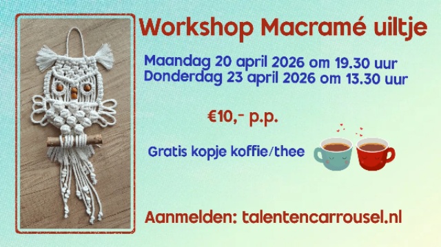 De Talentencarrousel organiseert van september t/m april maandelijks een workshop/activiteit in Wijkcentrum Wijchen Zuid voor inwoners van Wijchen en omgeving van 18 jaar en ouder. Organisatoren: Carijn Krekelberg en Carin Stevens